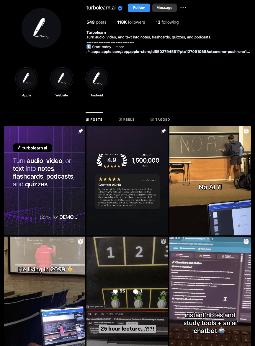 I found two Instagram accounts, and the main one @turbolearn.ai had 118K followers. These accounts reposted top-performing TikTok content as reels to capture IG users who may not have seen their TikToks.